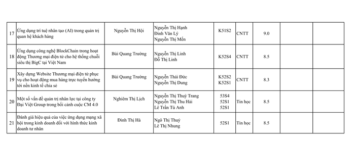 Năm học 2017 - 2018, cả 2 ngành là ngành TMĐT và ngành HTTT Kinh tế có 21 đề tài NCKH sinh viên. Các đề tài sau đã vinh dự đạt giải các cấp:
