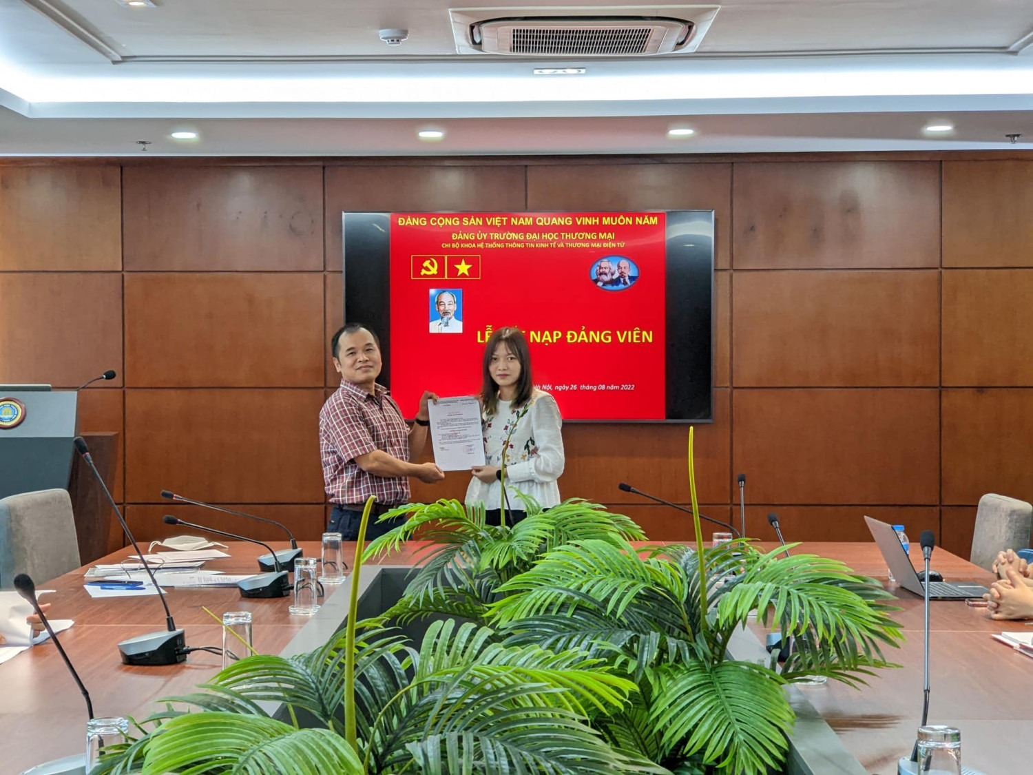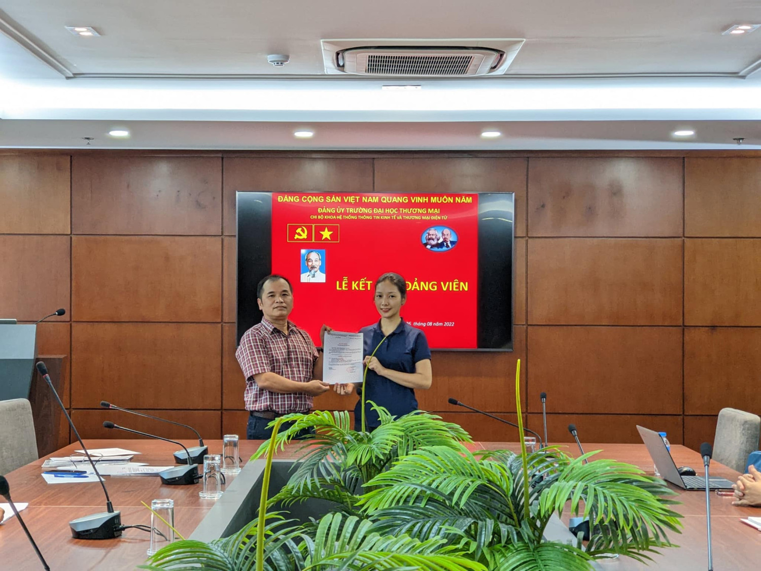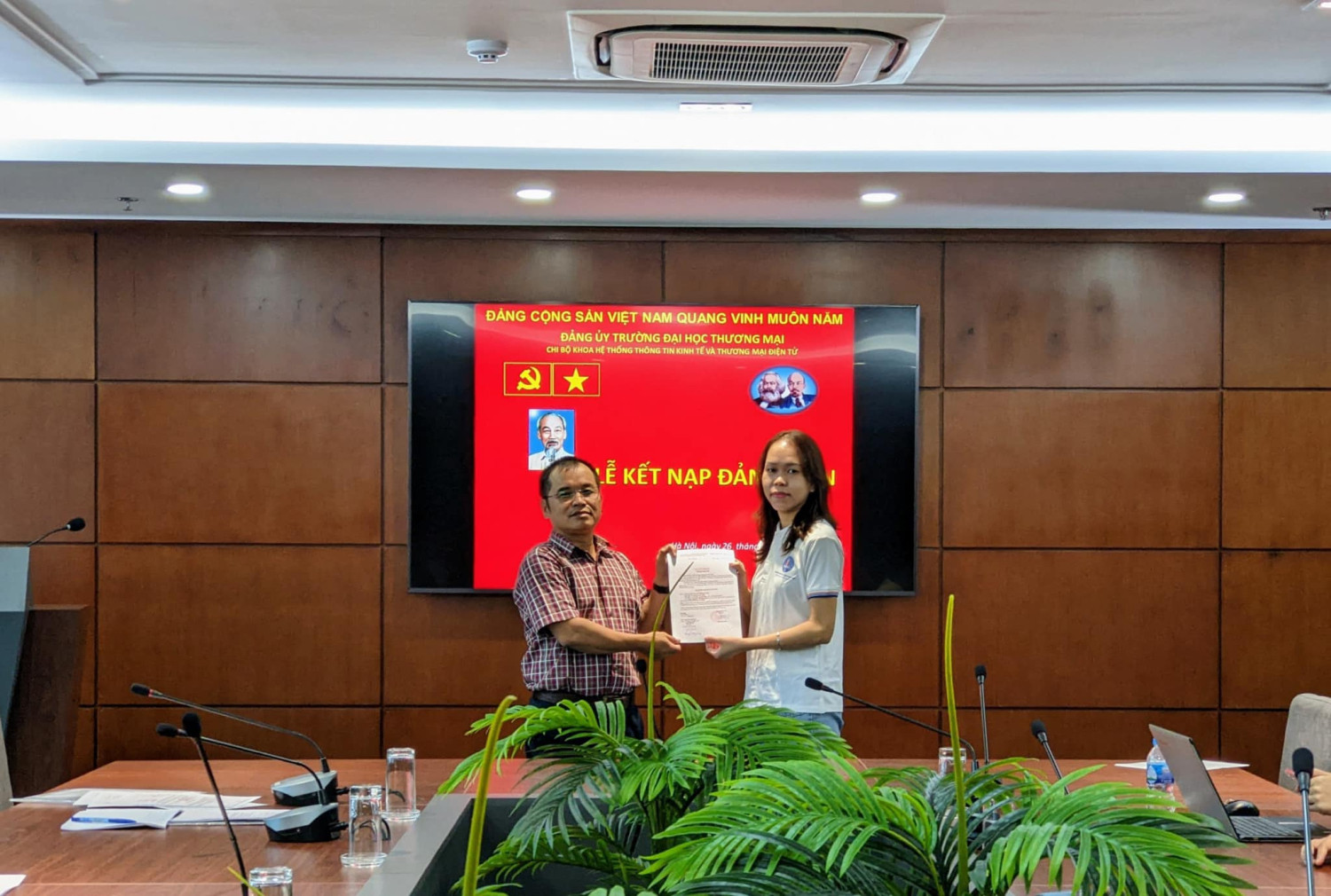 Được sự đồng ý của Đảng uỷ trường Đại học Thương mại, sáng ngày 26/08/2022, tại Phòng khánh tiết nhà F, Chi bộ Khoa HTTT Kinh tế và TMĐT đã tổ chức Lễ kết nạp Đảng cho các quần chúng: 1. Lê Phương Thuý - Sinh viên lớp K55S1 - Khoa HTTT Kinh tế và TMĐT - Trường Đại học Thương mại 2. Nguyễn Ngọc Minh Châu- Sinh viên lớp K55S2 - Khoa HTTT Kinh tế và TMĐT - Trường Đại học Thương mại Sau khi tuyên thệ, Chi bộ phân công các đ/c Đảng viên: Đ/c Nguyễn Thị Hội giúp đỡ đ/c Lê Phương Thuý , Đ/c Nguyễn Thị Hiền giúp đỡ đ/c Nguyễn Ngọc Minh Châu. Chúc mừng hai đồng chí đã được đứng trong hàng ngũ Đảng viên Đảng cộng sản Việt Nam. Chúc cho các đồng chí Đảng viên mới luôn: Thực hiện tốt những nhiệm vụ của Đảng viên ở Điều 2 của Điều lệ Đảng Cộng sản Việt Nam Phát huy những quyền hạn theo QĐ trong Điều 3 của Điều lệ Đảng Cộng sản Việt Nam Tiếp tục rèn luyện, phấn đấu trong học tập, nghiên cứu khoa học và hoạt động phong trào, đoàn thể của Khoa HTTT Kinh tế và TMĐT. Sau khi lễ kết nạp đảng, Đồng chí Nguyễn Hưng Long- Bí thư chi bộ Khoa Hệ thống TTKT & TMĐT trao quyết định công nhận Đảng viên chính thức cho 4 đồng chí: 1. Đ/c Đào Thị Lý K54I1 2. Đ/c Trần Thị Linh Chi K53I4 3. Đ/c Lê Hương Giang K53S2 4. Đ/c Nguyễn Thị Thuỳ Trang K53S4 Chúc mừng 4 đồng chí đã trở thành đảng viên chính thức và mong rằng các đồng chí sẽ phát huy năng lực tối đa trong các hoạt động xứng đáng với vai trò của người Đảng viên trẻ! Một số hình ảnh trong buổi lễ: