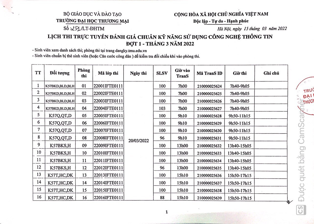 Thông báo lịch thi trực tuyến đánh giá chuẩn kĩ năng sử dụng CNTT đợt 1 tháng 3 năm 2022.