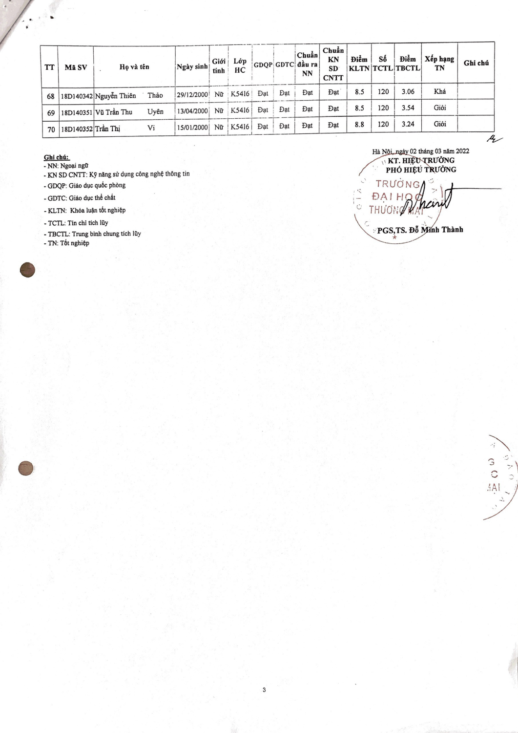 Quyết định 259/QĐ-ĐHTM của Đại học Thương mại ngày 02 tháng 03 năm 2022 về việc công nhận tốt nghiệp đại học chính quy cho 50 sinh viên chuyên ngành Quản trị hệ thống thông tin khóa 54 và Khóa cũ.