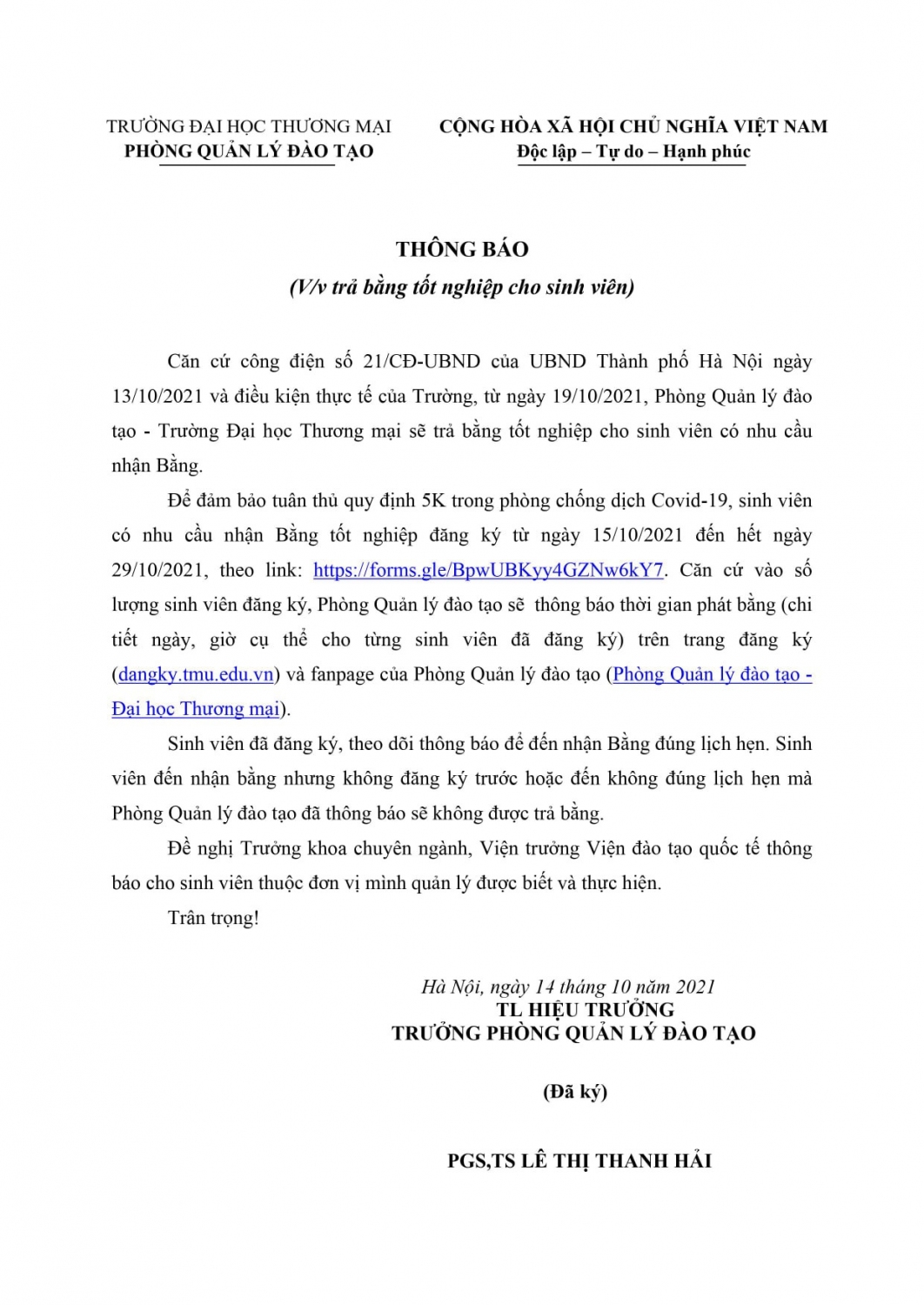 Để đảm bảo tuân thủ quy định trong phòng chống Covid, Phòng Quản lý đào tạo sẽ căn cứ vào số lượng sinh viên đăng ký để thông báo thời gian cụ thể đối với từng sinh viên qua dangky.tmu.edu.vn hoặc qua fanpage của Phòng quản lý đào tạo. Do đó, Sinh viên có nhu cầu nhận Bằng tốt nghiệp đăng ký từ ngày 15/10/2021 đến hết ngày 29/10/2021, theo link: https://forms.gle/BpwUBKyy4GZNw6kY7.